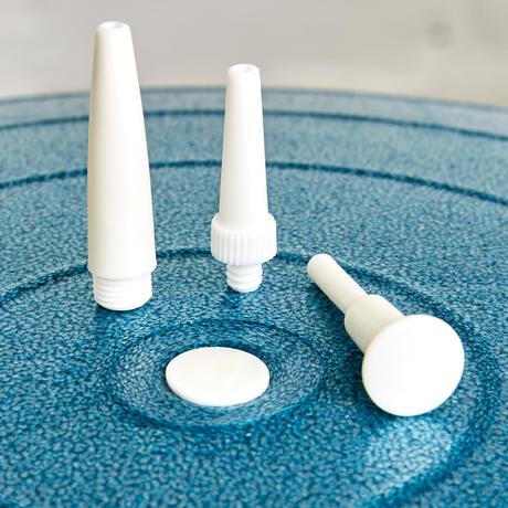 Ball aufpumpen, Ansatzstück der Pumpe entfernen, das Loch mit dem Finger zuhalten und den Stöpsel in die andere Hand nehmen. Setz dich auf den Ball, passe die Größe an und verschließe das Loch anschließend mit dem Stöpsel.