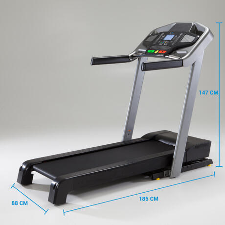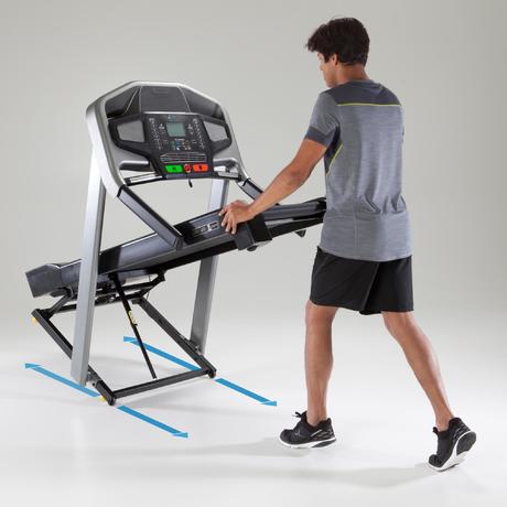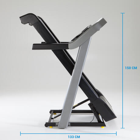 Das Laufband T900 ist zusammenklappbar und kann somit platzsparend verstaut werden. Die benötigte Abstellfläche sollte 133 × 88 cm groß sein.