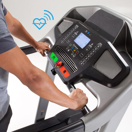 Das Laufband T900 ist mit Herzfrequenzsensoren und einem noch verlässlicheren Brustgurt ausgestattet. Mit diesem Zubehör kannst du beim Training deinen Puls überwachen.
