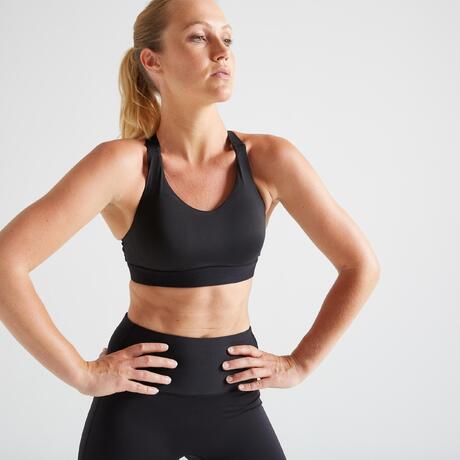 Das Sport-Bustier 500 mit mittlerem Stützeffekt*, eignet sich für Sportarten mit mittlerer Stoßbelastung (Fitness Dance, Cardiotraining, Crosstraining). Durch das anspruchsvolle Design mit weichem Bund kann es auch alleine getragen werden. Schwimmerrücken aus funktionalem, belüfteten Material, das Feuchtigkeit gut ableitet. Integrierte, herausnehmbare Pads, ohne Bügel, optimaler Tragekomfort. * reduziert Stöße um 45 % (im Vergleich zu normalem BH) bei Sportarten mit mittlerer Stoßbelastung .