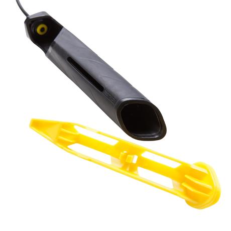 Du kannst pro Seite den Griff mit max. zwei 75-g-Gewichten (separat erhältlich) beschweren. Drehe dazu den Griff des Springseils so, dass du den farbigen Knopf vor dir hast. Drücke auf den Knopf: Jetzt öffnet sich das Gewichtsfach. Lege ein oder zwei Gewichte in die dafür vorgesehenen Fächer. Setze das Gewichtsfach anschließend wieder in den Griff.